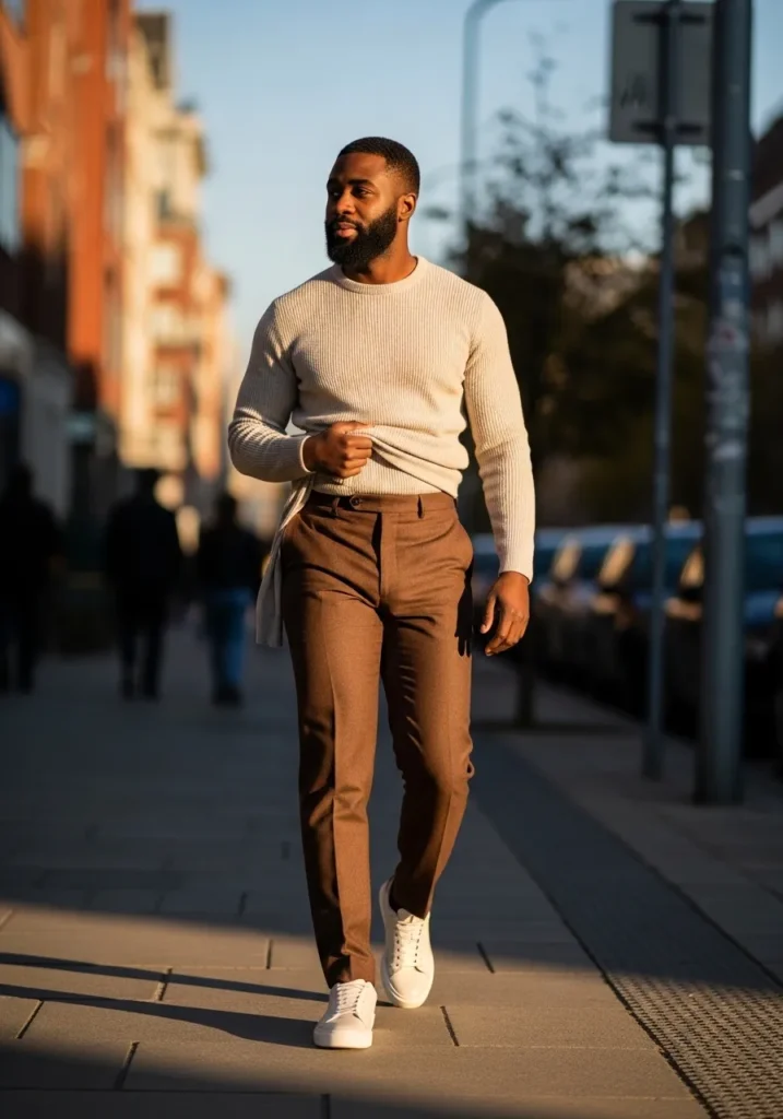 This look blends comfort and polish in such a natural way. He is wearing tailored medium brown trousers with a slim fit and clean front that keeps everything streamlined. The fabric falls smoothly down the leg and looks structured but not stiff. On top, a light beige ribbed knit sweater adds texture and softness, giving the outfit a relaxed edge. Crisp white leather sneakers finish the look and make it feel fresh and modern. The warm light hitting the brown tones makes the whole outfit glow.