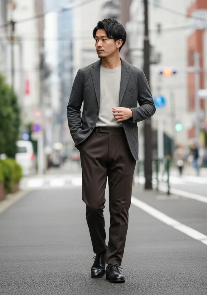 I love how balanced this combination feels. The mix of brown and gray is subtle but so chic, and the simple tee keeps it from feeling too formal. It looks like he put real thought into color coordination without overcomplicating anything. If you are into that effortless urban style that works for meetings, coffee dates, or dinner plans, this one hits the mark. It feels modern, flattering, and very intentional in the best way.
