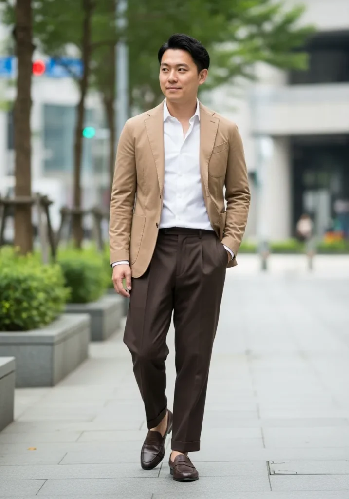 This look highlights dark brown loafers paired with deep brown trousers, a white shirt, and a warm camel blazer. The loafers blend seamlessly with the earthy tones, adding richness and depth. Their smooth leather finish keeps the outfit refined and cohesive.