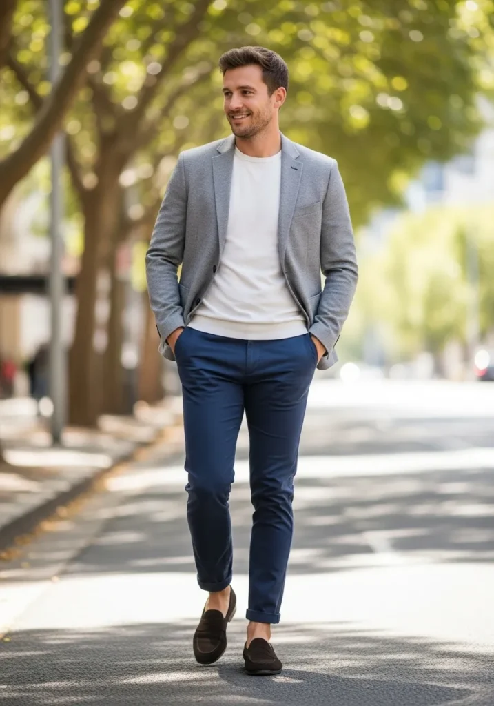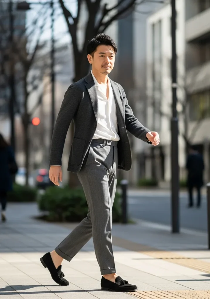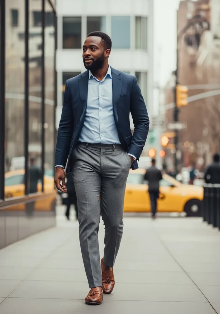 This outfit pairs classic black loafers with navy trousers, a white shirt, and a charcoal blazer. The loafers keep everything sleek and streamlined, matching the darker palette perfectly. The overall vibe feels modern, polished, and city smart.