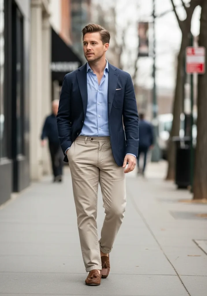 Dark Loafers With Navy Blazer and Beige Trousers