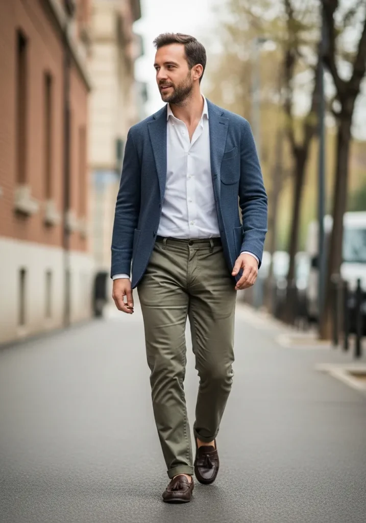 This look pairs dark brown loafers with olive green trousers, a crisp white shirt, and a navy blazer. The loafers add depth and richness, grounding the lighter tones of the outfit. Their sleek shape keeps the look refined while still feeling comfortable and easy to wear.
