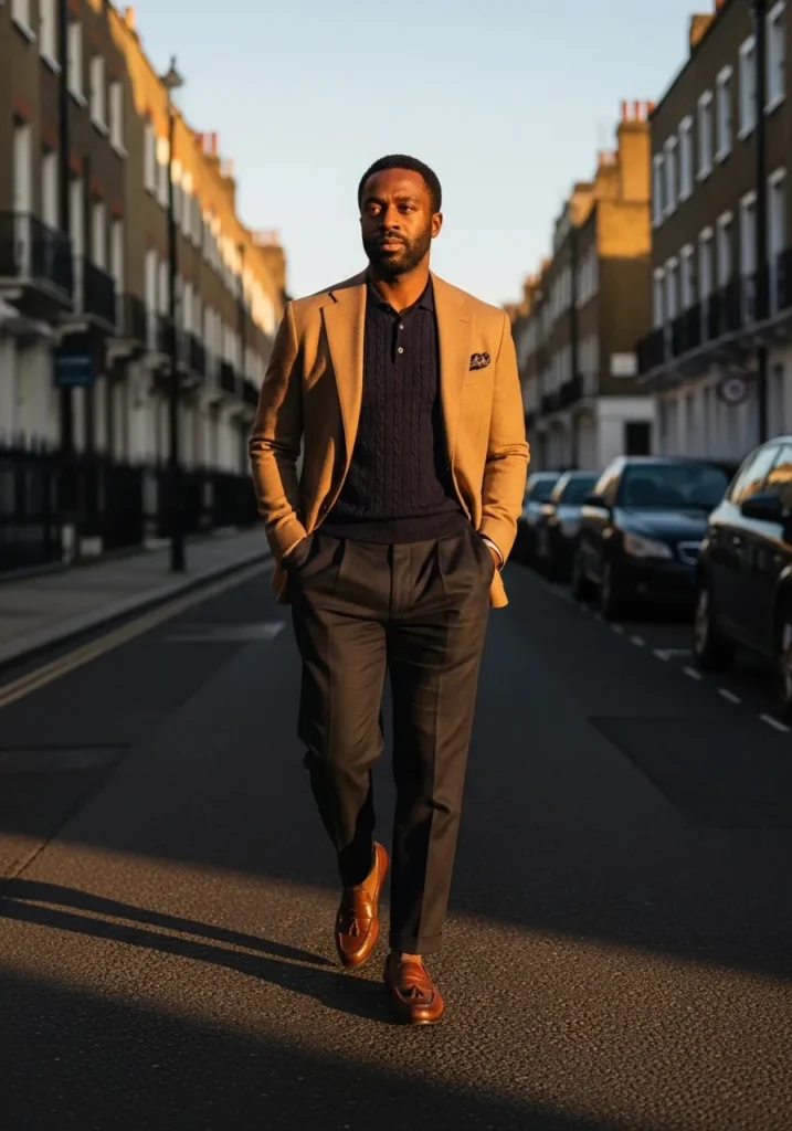 Tan Loafers With Camel Blazer and Dark Trousers