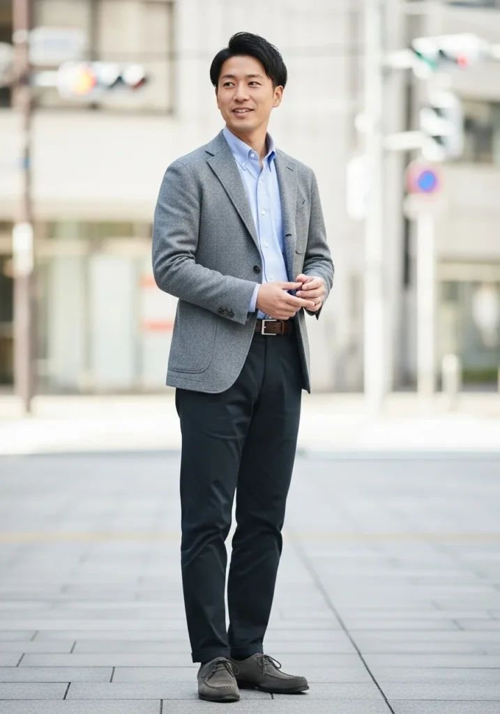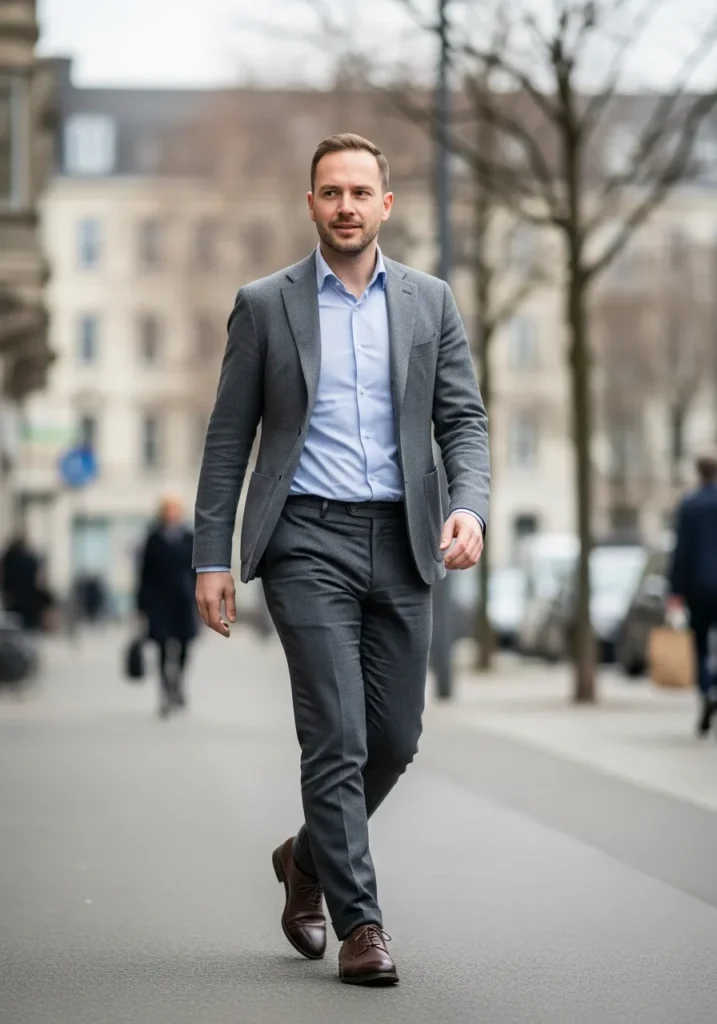 Here we see a tailored grey blazer layered over a light blue button up shirt, paired with dark trousers and classic leather shoes. The blazer has a sleek fit that sharpens the silhouette, while the blue shirt adds a fresh and professional touch. Dark pants ground the outfit and give it that elevated business casual feel that works perfectly in a city setting.