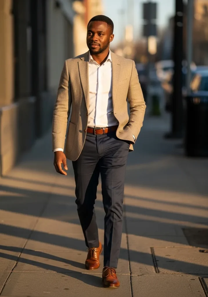 This look pairs a tan blazer with a crisp white button up shirt and darker trousers. The blazer adds warmth and softness, while the white shirt keeps everything clean and classic. The trousers bring contrast and structure, creating a balanced and polished business casual outfit.