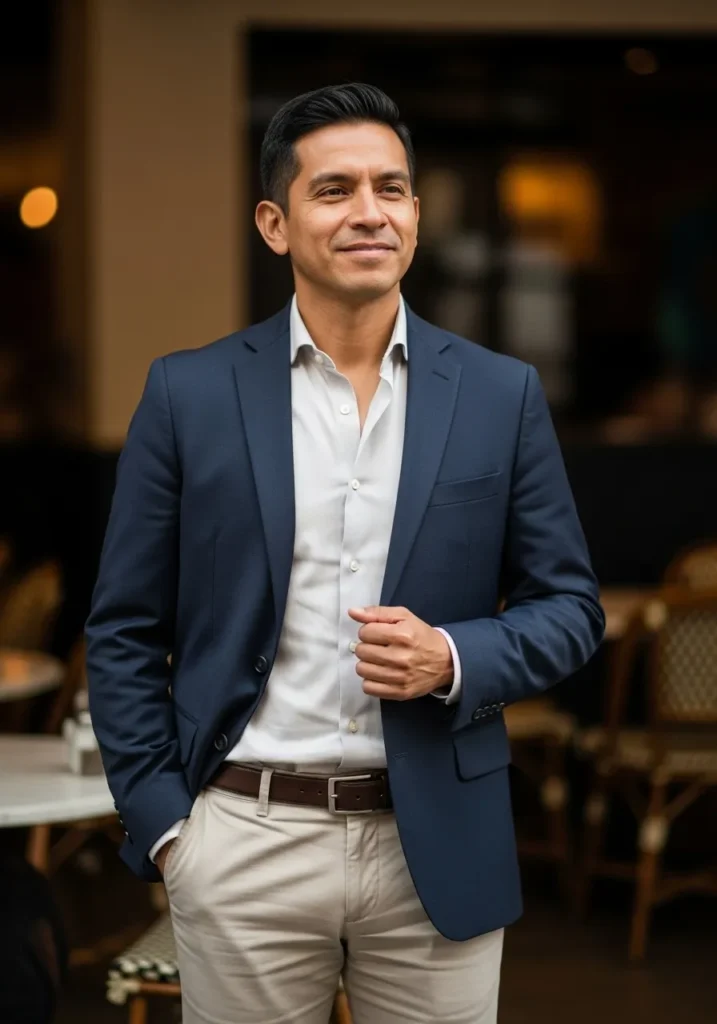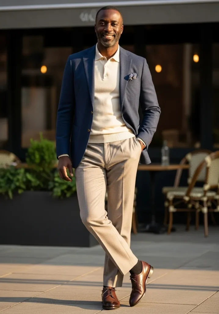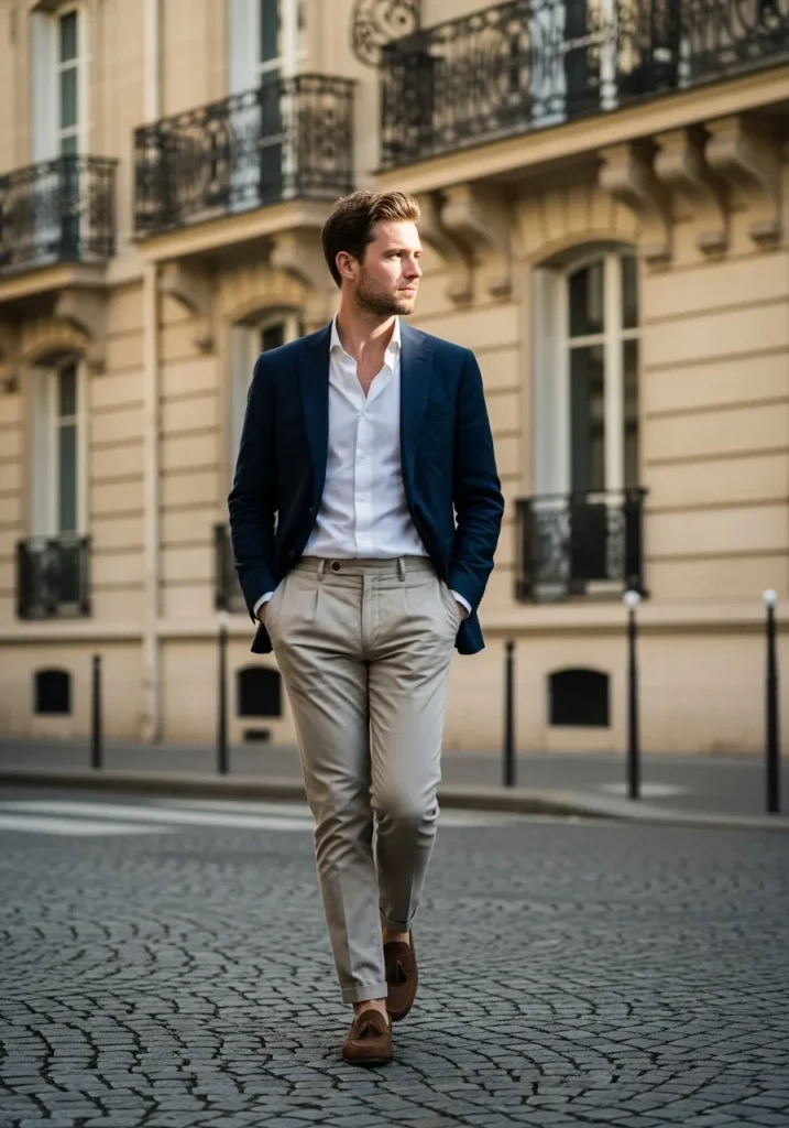 This look combines a deep navy blazer with a soft white knit top and tailored beige trousers. The blazer adds structure and depth, while the lighter trousers keep the outfit airy and elegant. Brown leather loafers finish the look and add a relaxed but upscale feel that fits perfectly with the polished city setting.