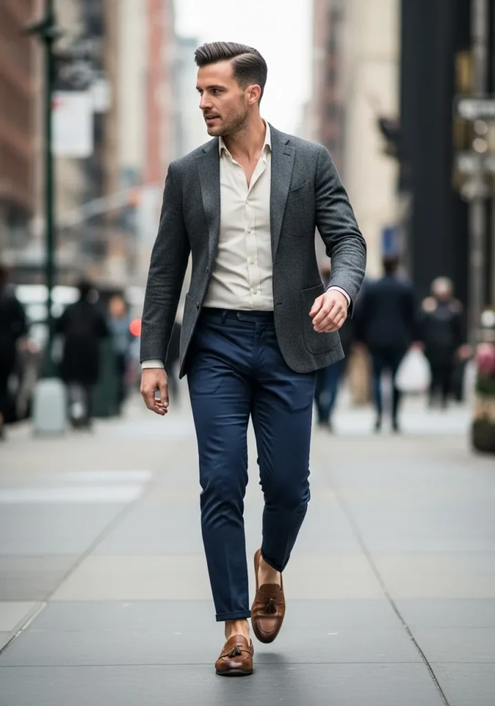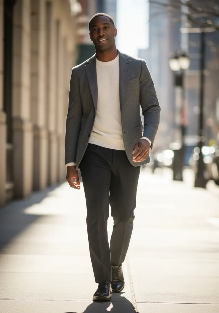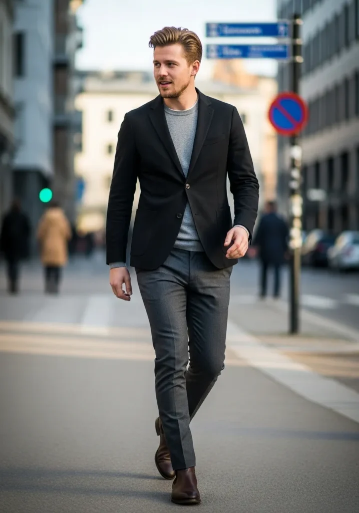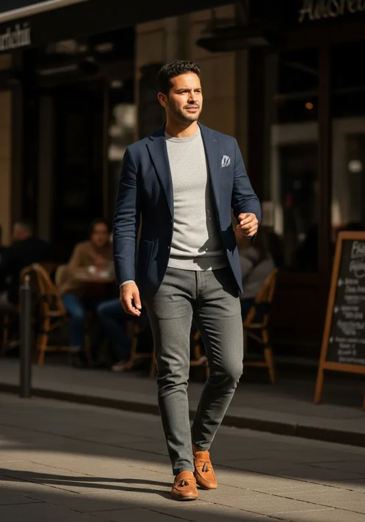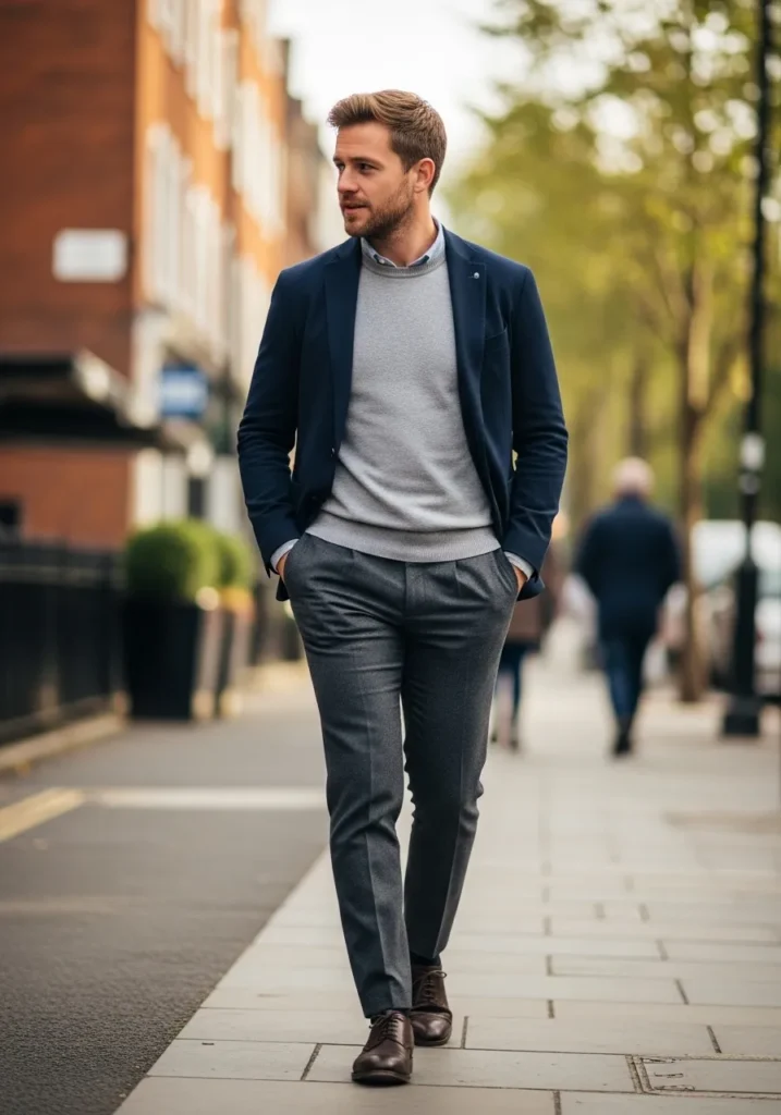 This look features a navy blazer layered over a soft grey knit top with slim grey trousers. The blazer adds structure, while the knit brings comfort and texture. The neutral palette keeps everything cohesive and polished, perfect for a smart city walk.
