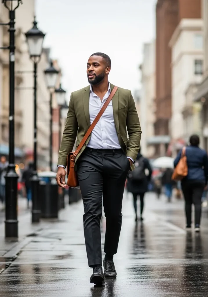 This outfit pairs an olive green blazer with a white shirt, dark trousers, and a brown crossbody bag. The blazer adds an earthy tone that feels modern and stylish. The bag brings a practical and slightly casual touch that still looks intentional and elevated.