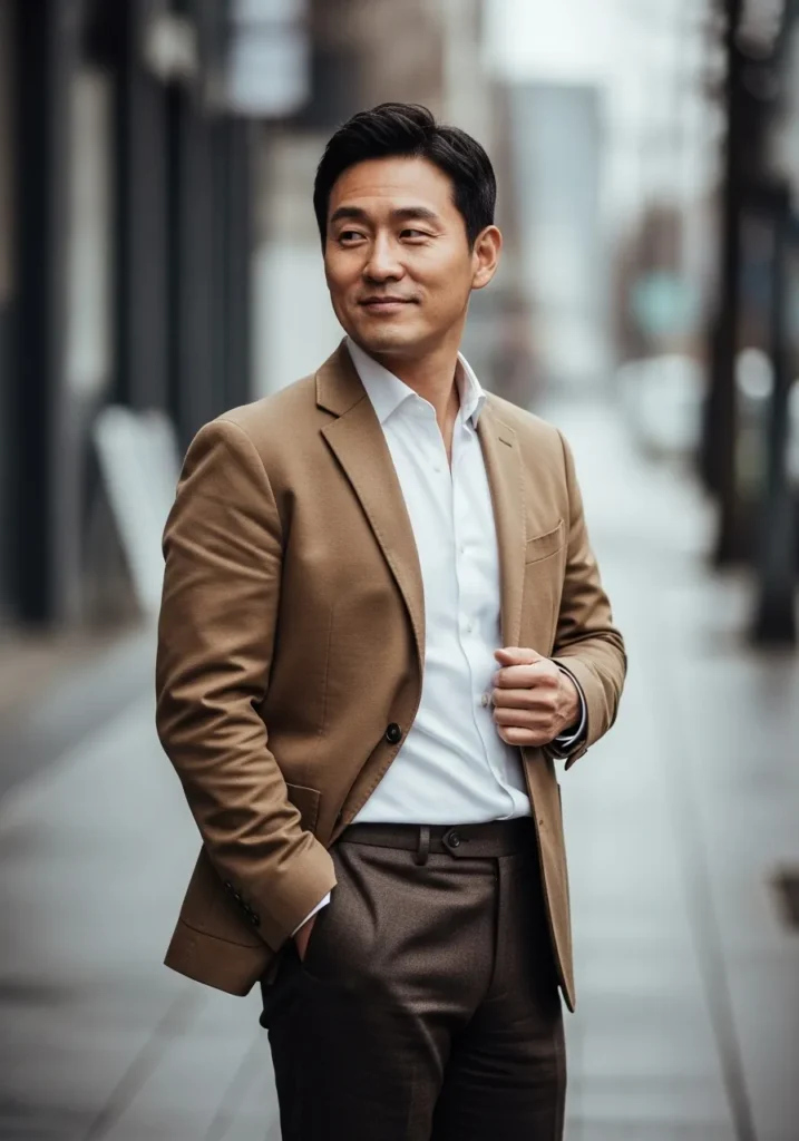 This outfit combines a camel blazer with a crisp white open collar shirt and dark trousers. The blazer adds warmth and softness, while the open neckline keeps things relaxed and stylish. Dark trousers ground the look and keep it firmly in business casual territory.