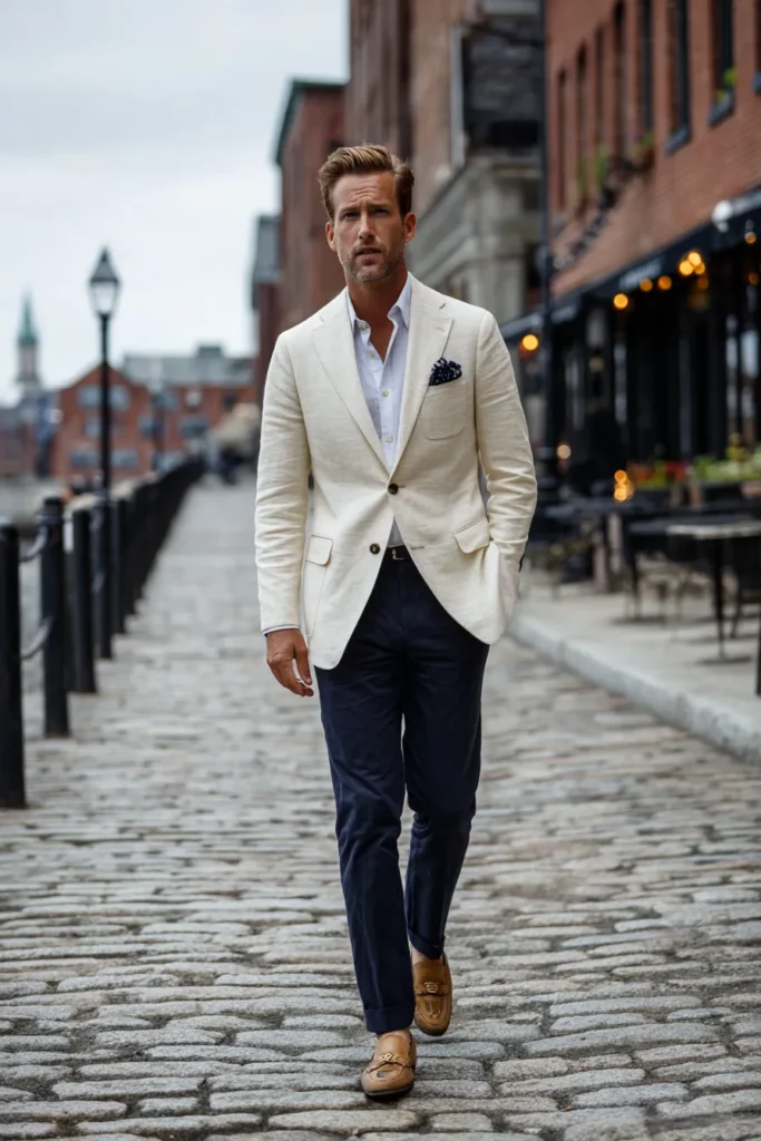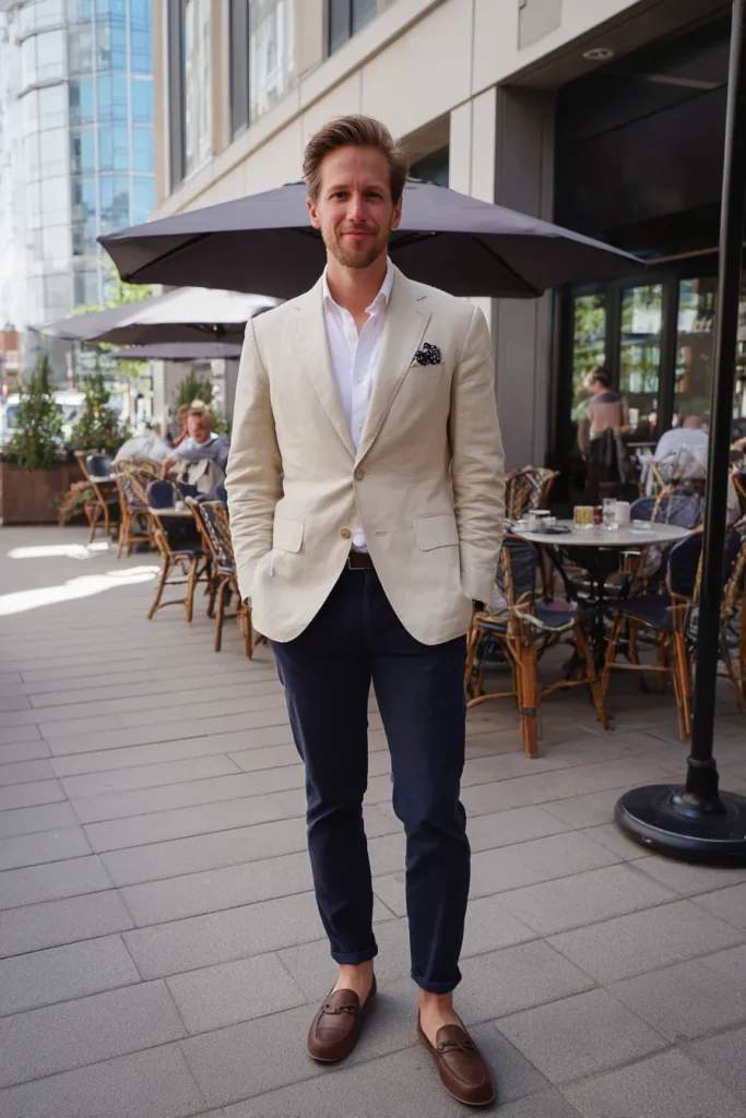 This outfit is the definition of summer chic featuring a stunning light beige linen blazer paired with navy blue chinos and the perfect finishing touch of dark brown leather loafers sans socks. The crisp white button-down shirt underneath creates a fantastic contrast with the darker trousers, while a peek of a patterned pocket square adds a tiny dash of personality. It’s a look that screams casual sophistication, making it perfect for an upscale brunch or a summer evening out on a patio.