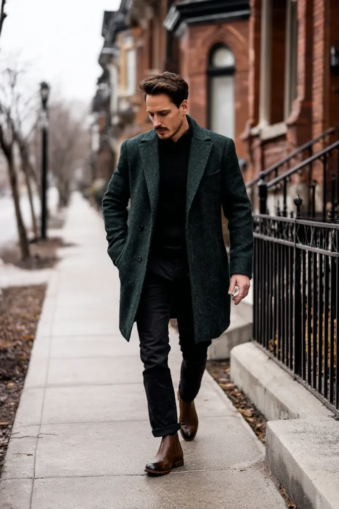 This is the ultimate handsome cold-weather look, relying on deep, rich textures and colors for maximum impact. The standout piece is a fabulous dark green or forest green wool overcoat with a slightly textured, almost tweed-like finish. Underneath, everything is kept sleek and monochromatic with a black sweater and dark charcoal or black trousers, possibly deep indigo denim. The final touch that prevents this from being entirely black is a pair of fantastic medium-brown leather Chelsea boots, which peek out elegantly above the cuffed trousers.