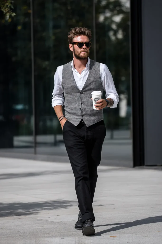 I really appreciate how this outfit utilizes a typically formal item, the vest, in such a cool, relaxed way. Taking off the suit jacket and keeping the vest on instantly elevates the simple shirt and black pants combo, giving the look so much character and structure without feeling stuffy. Some people love that the pattern on the vest is subtle but adds a fantastic visual texture that keeps the entire monochrome palette interesting. It’s an easy way for a guy to show off a little personal style while still looking incredibly polished and put-together.