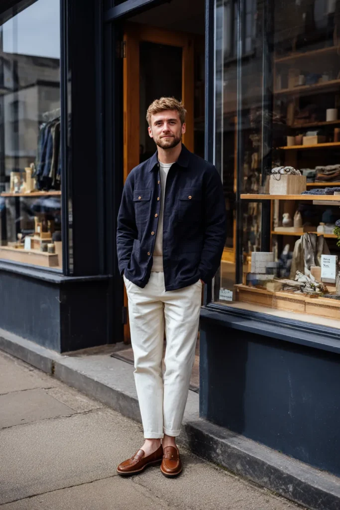 This outfit is the definition of elevated casual wear, showcasing a beautiful contrast between light and dark colors. The top layer is a structured dark navy or indigo shirt jacket, sometimes called a shacket, worn open over a simple cream or off-white t-shirt or light sweater. This dark, utilitarian top is paired with fantastic light cream or off-white chinos that are slightly cuffed for a relaxed feel. Finishing the look are classic tan or cognac leather loafers worn without socks, giving the whole ensemble a refined, yet totally comfortable vibe.