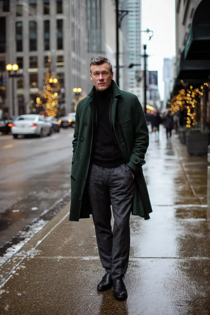 This is an incredibly sharp and warm outfit that brings a stunning pop of color to dark winter dressing. The star of the show is a sophisticated long overcoat in a deep, rich hunter green or emerald wool, providing fantastic texture and structure. Everything underneath is kept sleek and monochromatic with a black turtleneck sweater and dark charcoal gray or subtle checked wool trousers. The look is completed with polished black leather boots or dress shoes, making this the perfect power outfit for freezing city streets or upscale holiday gatherings.