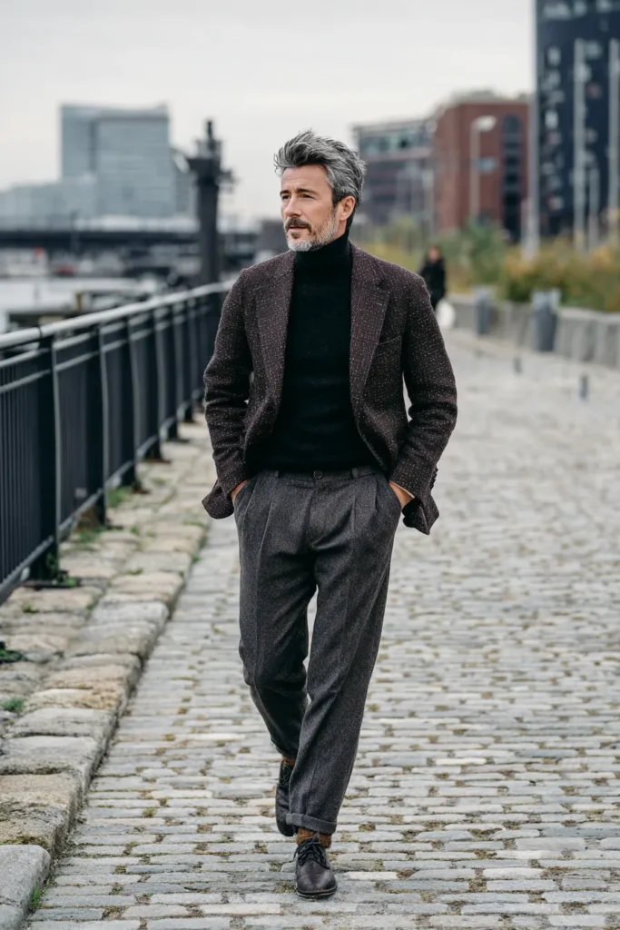 This sophisticated fall look is all about mixing beautiful textures in a deep, moody color palette. The top half features a dark charcoal or burgundy patterned sport coat, likely a textured tweed or knit, worn over a sleek black turtleneck sweater. On the bottom, he’s wearing tailored, flowing charcoal gray wool trousers with a comfortable drape and pleats. The whole look is finished with dark brown or black leather brogues or boots, creating an incredibly elegant and intellectual vibe perfect for a crisp day by the waterfront.