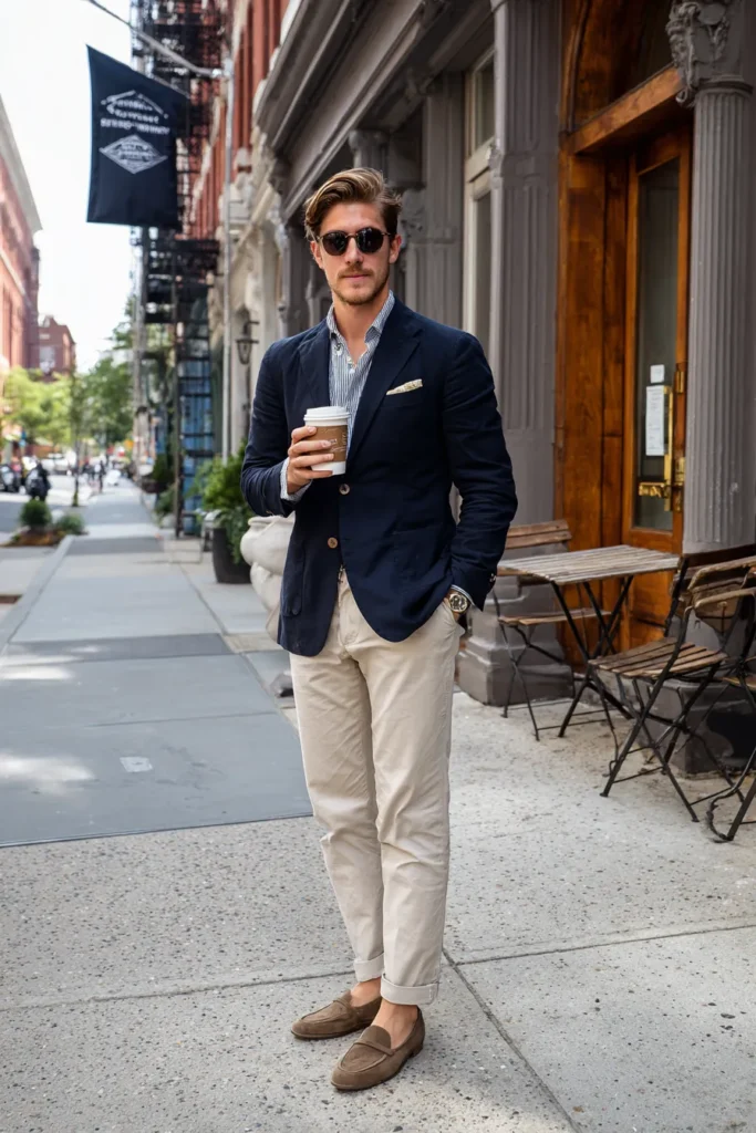 This final look is a perfect example of smart-casual dressing that feels cool and confident for warm city days. The outfit uses a classic high-contrast pairing featuring a well-fitted dark navy blue sport coat over a light blue and white striped shirt that’s casually unbuttoned. The jacket is beautifully balanced by light beige or khaki chinos that are neatly cuffed above the ankle. Finishing the look are tan suede loafers worn sockless and cool, classic dark sunglasses, giving off a great, relaxed jet-setter vibe.