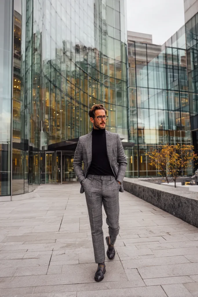 This outfit is the definition of modern, intellectual elegance, taking a classic suit and making it feel incredibly fresh. It features a sharply tailored gray suit with a subtle, eye-catching glen plaid or windowpane check pattern throughout. Instead of a shirt and tie, it’s paired with a sleek black turtleneck sweater underneath, creating a clean, dark line that’s so flattering. The look is completed with polished black leather Chelsea boots or dress shoes, making this the perfect power look for a contemporary office or a chic evening event.