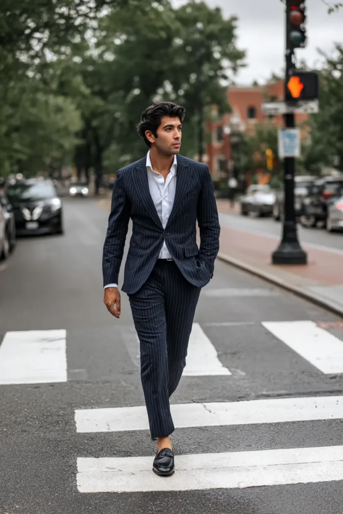 This incredibly sharp ensemble takes a classic pattern and makes it modern by embracing a sleek, tailored fit and skipping the necktie. It features a perfectly fitted navy blue suit with a fine white pinstripe, worn over a crisp, slightly unbuttoned white dress shirt. The dark, bold vertical lines create an overall striking look that feels powerful and contemporary. Finishing off this streamlined outfit are a pair of polished black leather loafers, worn without socks to add a final touch of casual sophistication.