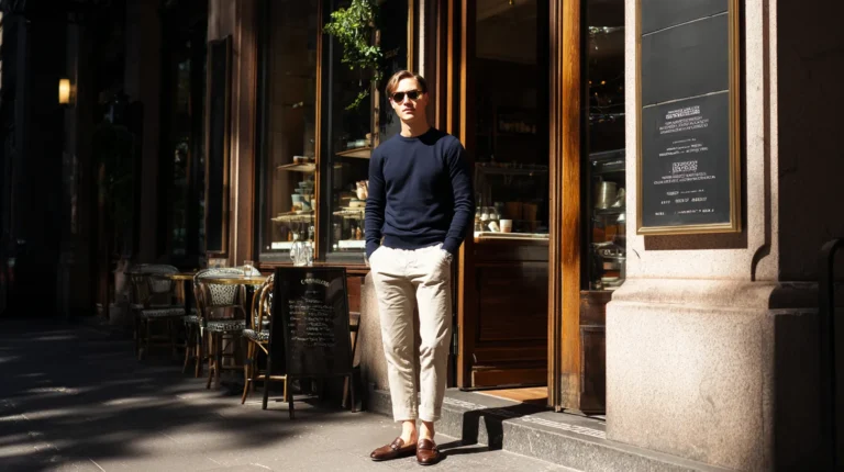 What makes this look so appealing to me is the beautiful play of textures and the restrained color palette. The soft, relaxed feel of the ribbed sweater against the more structured and refined fabric of the trousers is pure genius; it keeps the outfit from feeling too casual or too stuffy. The cuff on the trousers is such a key styling detail—it shows off a little ankle and highlights those gorgeous suede loafers. This outfit proves that you don’t need a lot of fuss or color to look incredibly handsome and utterly sophisticated.