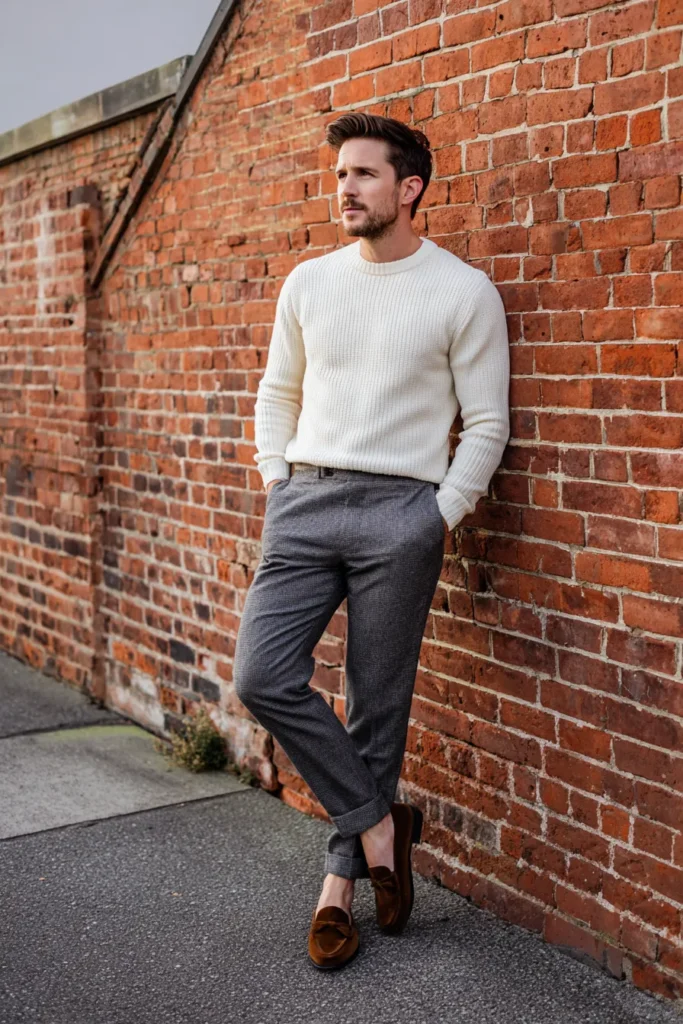This cozy yet sophisticated outfit features a chunky cream or off-white crewneck sweater with a noticeable textured knit, offering fantastic warmth and dimension. It’s perfectly paired with sharp gray wool trousers that have a subtle tweed or check pattern and are neatly cuffed at the ankle. The whole look is grounded with a pair of rich brown suede loafers, adding a touch of luxurious texture and a deep, earthy color contrast. This is a wonderfully put-together ensemble that’s just ideal for cooler months when you still want to look chic and polished.