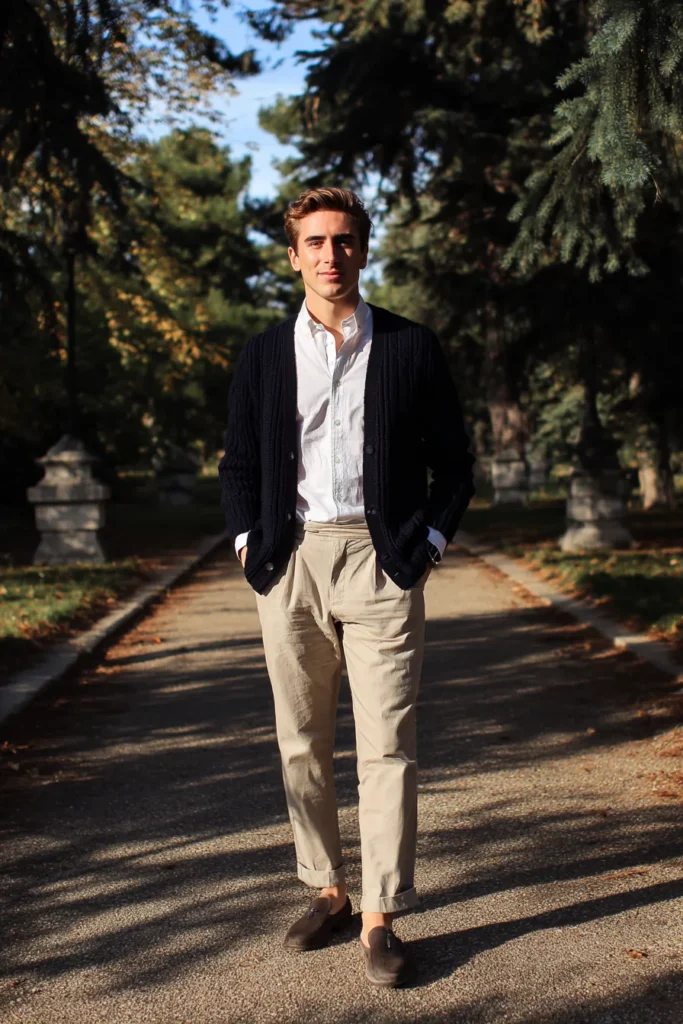 I think this outfit works so well because it’s a perfect example of effortless layering. The dark cardigan provides that wonderful, cozy fall or spring vibe while the light trousers keep the look fresh and modern. The key detail for me is the fit of those trousers; the high waist and relaxed drape feel incredibly chic and make the outfit look perfectly tailored yet totally comfortable. This is a brilliant demonstration of how simple, classic pieces in great colors can look super polished without any extra effort—a guy wearing this just looks instantly thoughtful and stylish.