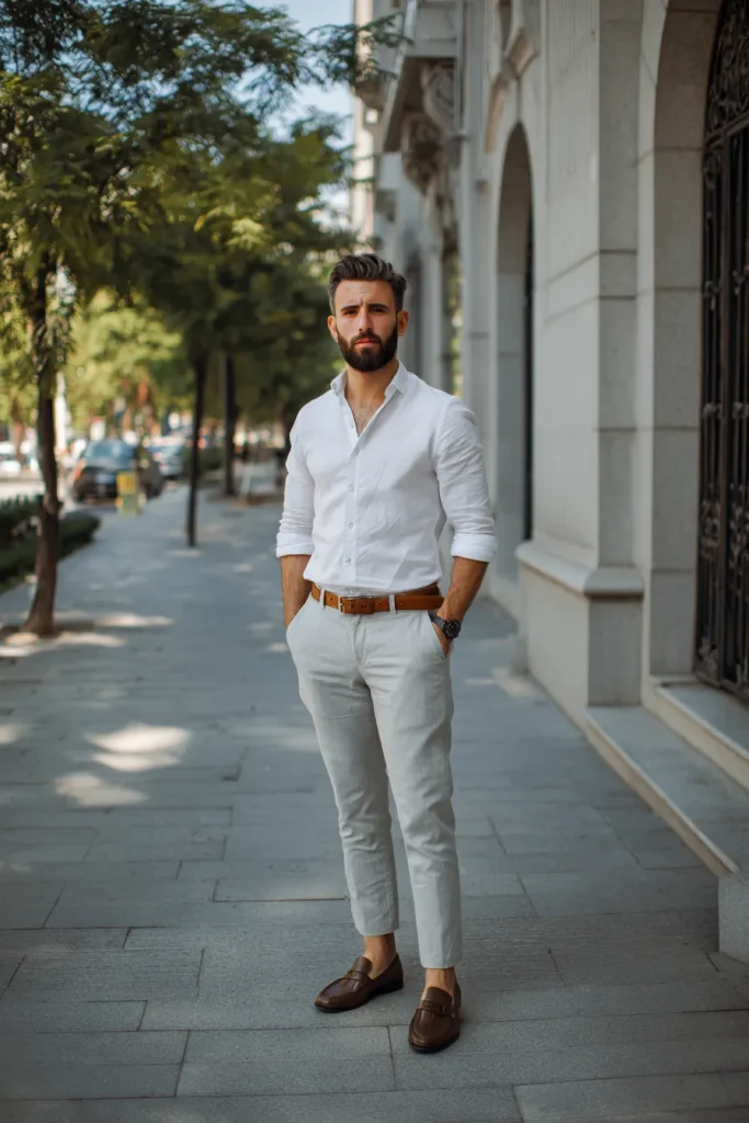 This outfit is the definition of clean summer style built around a light, airy palette that just feels so fresh. It features a crisp white linen or cotton button-down shirt with the sleeves casually rolled up, paired with a perfectly tailored pair of light gray trousers. The darker accessories provide a lovely contrast, including a brown leather belt and classic dark brown leather loafers worn without socks. It’s an easy yet refined look that’s ideal for warm weather gatherings or daytime events when you want to look sharp but not too formal.