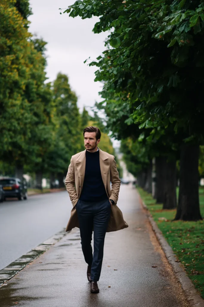 This outfit is the epitome of timeless, sophisticated layering, perfect for those cooler days when you still want to look polished. It centers around a classic camel or khaki trench coat draped over a simple dark navy crewneck sweater. This is paired with tailored, dark charcoal gray trousers and finished with sleek dark brown or burgundy dress shoes. The overall vibe is incredibly handsome and effortlessly put-together, like something straight out of a classic movie set in a major European city.