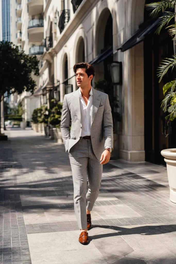 I absolutely think this look is incredibly chic because the fit and color are just spot on. That light gray is such a versatile and flattering color for warmer months, and the way the suit is tailored makes the whole look streamlined and expensive. Some people love how leaving the shirt unbuttoned at the top instantly makes a formal suit feel approachable and cool, achieving that effortless Italian vibe. The choice of warm brown loafers instead of traditional black dress shoes is genius, adding a contemporary touch that keeps the entire ensemble fresh and super stylish.