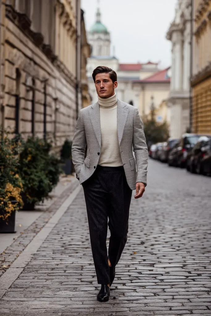 This look is the definition of European cold-weather chic, achieving ultimate sophistication through smart layering. The centerpiece is a handsome light gray sport coat with a subtle pattern like houndstooth or a small check, worn over a warm, creamy white turtleneck sweater. On the bottom, he’s wearing tailored dark charcoal gray wool trousers that provide a fantastic contrast. The outfit is grounded with sleek black leather loafers or dress shoes, making it an incredibly stylish choice for fall or winter city outings.