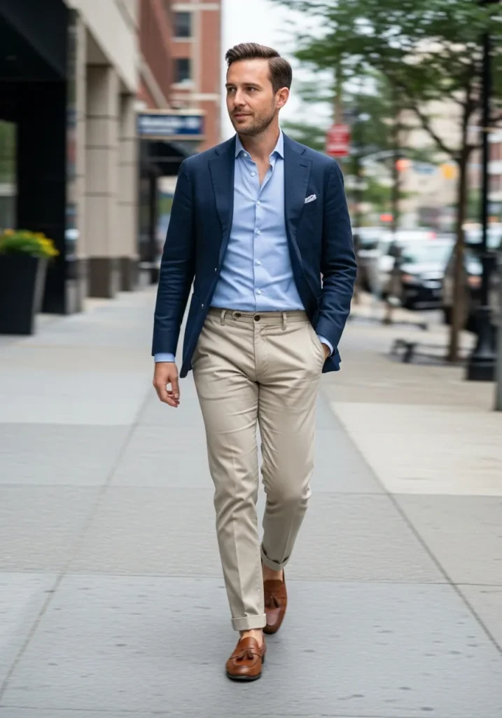 This outfit features a tailored navy blazer layered over a light blue button down shirt, paired with slim beige chinos and polished brown leather loafers. The clean color palette feels fresh and professional, while the relaxed fit keeps everything modern and wearable for everyday office life.