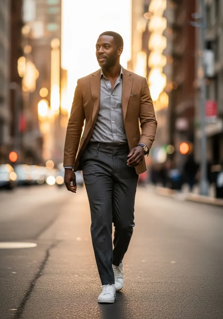 A warm camel blazer layered over a light gray tee, paired with dark tailored trousers and white sneakers, creates a chic mix of formal and casual. The blend of textures makes the outfit feel stylish and modern.