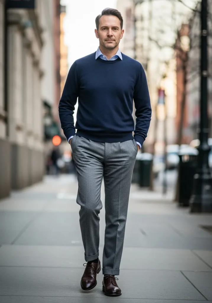 Navy Sweater With Gray Trousers