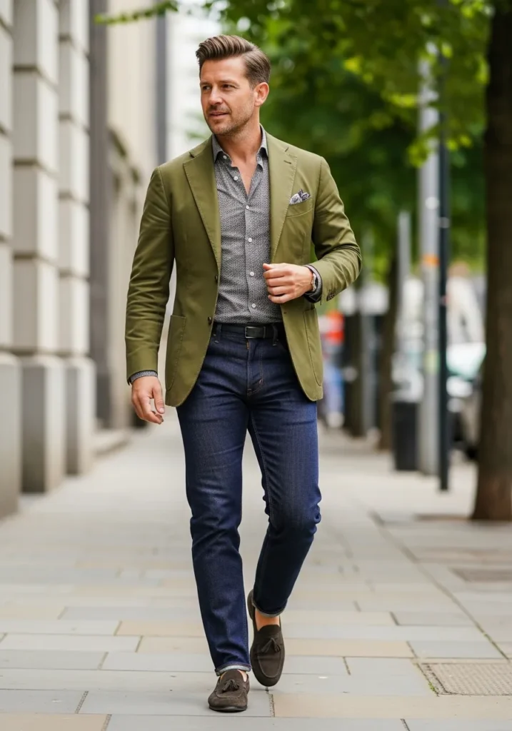 This outfit features a rich olive green blazer layered over a subtly patterned button down shirt, paired with dark blue jeans and brown leather loafers. The mix of earthy tones and classic denim creates a relaxed yet refined look that feels perfect for modern business casual settings.