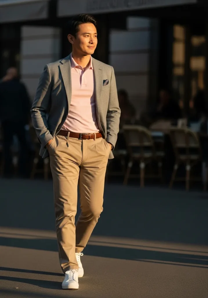 This polished look combines a tailored gray blazer with a soft blush pink shirt, tan chinos, and crisp white sneakers. The gentle color contrast feels fresh and contemporary, while the clean lines keep everything looking professional.