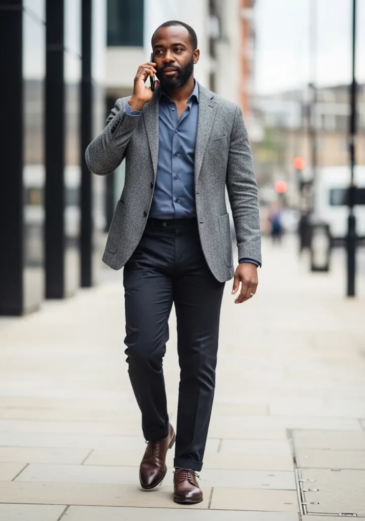 This outfit features a textured gray blazer layered over a slate blue button down shirt, paired with slim black trousers and polished brown leather lace up shoes. The soft texture of the blazer adds visual depth, while the cool toned shirt keeps the overall look modern, clean, and effortlessly professional.
