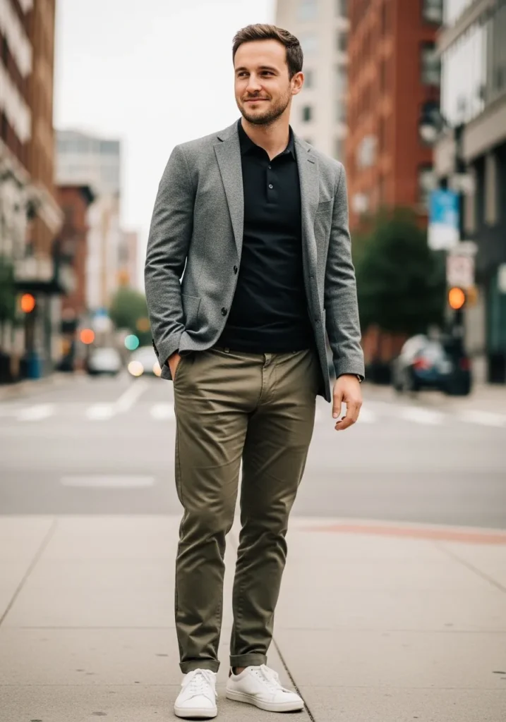 This modern outfit blends a light gray blazer with a black polo shirt, olive green chinos, and white sneakers for a relaxed yet intentional look. The color contrast feels crisp, while the casual pieces keep it approachable.