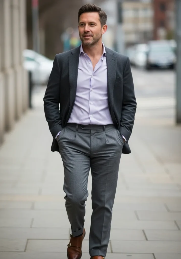 Here we have a charcoal blazer and matching trousers styled with a soft lavender button down and rich brown leather shoes. The tones feel refined and elevated, while the relaxed tailoring keeps the whole look firmly in business casual territory.