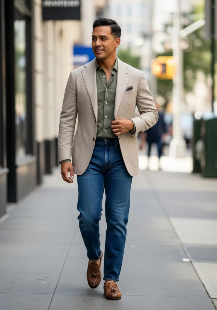 This outfit mixes a light beige blazer with a muted olive green shirt, classic blue jeans, and warm brown loafers for a relaxed but pulled together look. The textures and soft colors create a laid back sophistication that feels very modern.