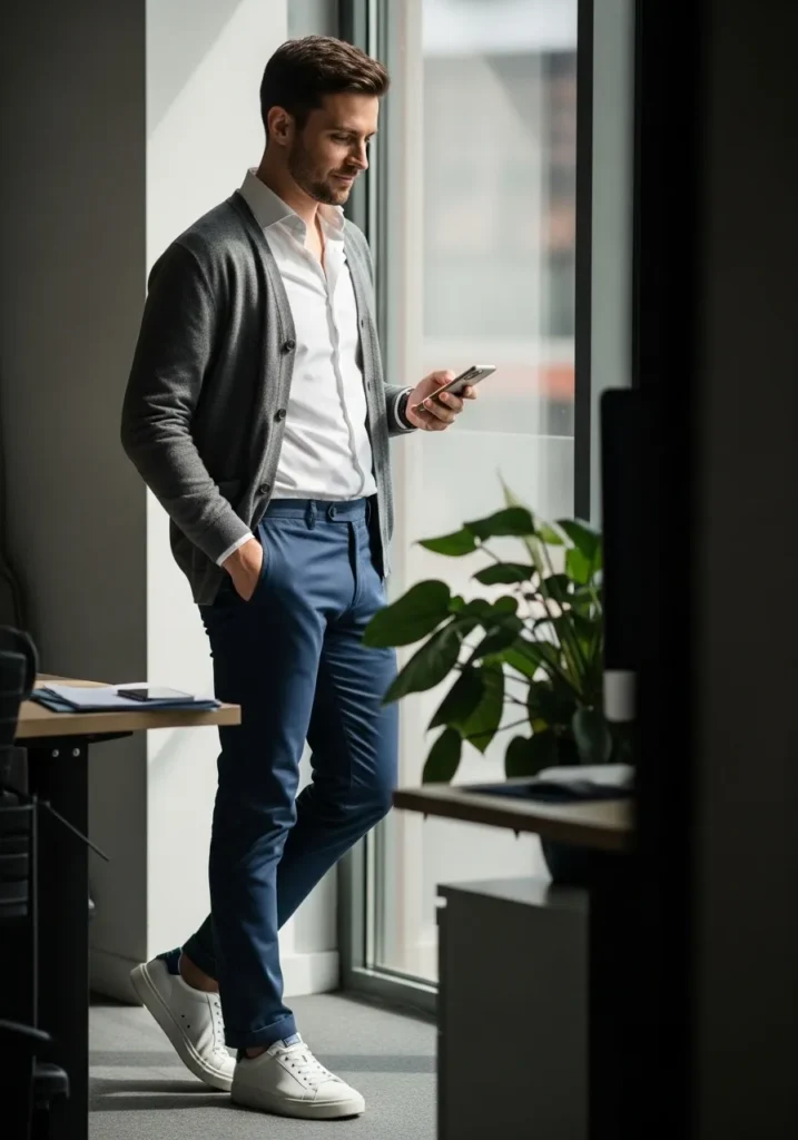 This outfit features a soft gray button front cardigan layered over a crisp white shirt, paired with tailored blue trousers and clean white sneakers. The lightweight knit adds a cozy, relaxed layer, while the structured trousers keep the look polished and office appropriate, creating a perfect balance between comfort and professionalism.