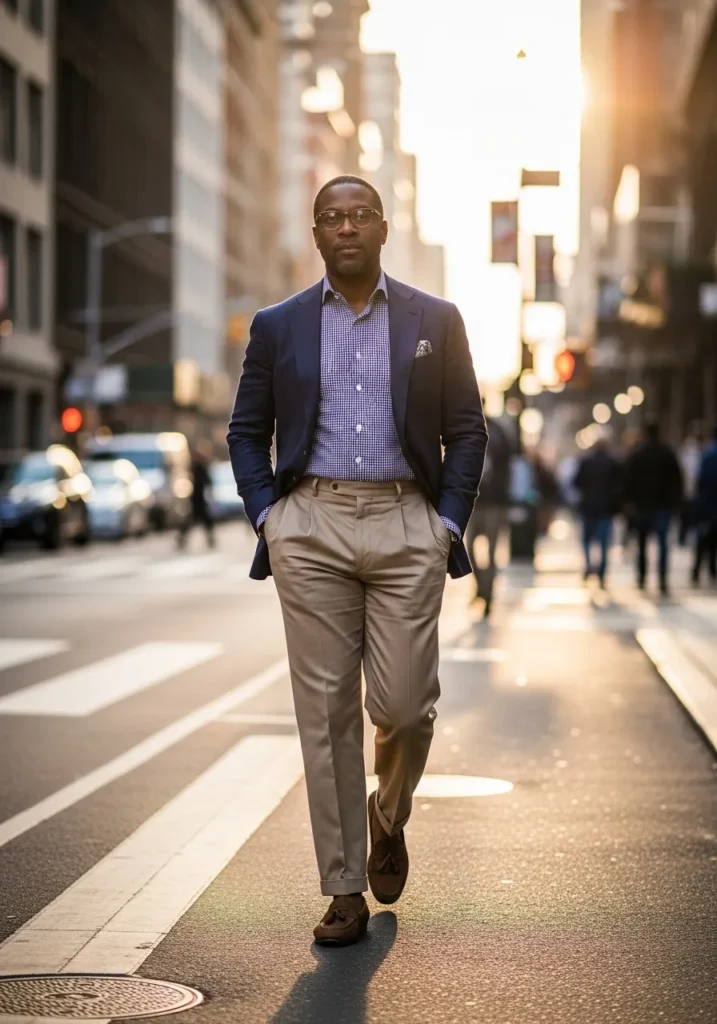This look features a deep navy blazer worn over a patterned shirt, styled with tailored tan trousers and classic brown shoes. The color contrast feels rich and warm, creating a sharp yet approachable silhouette.