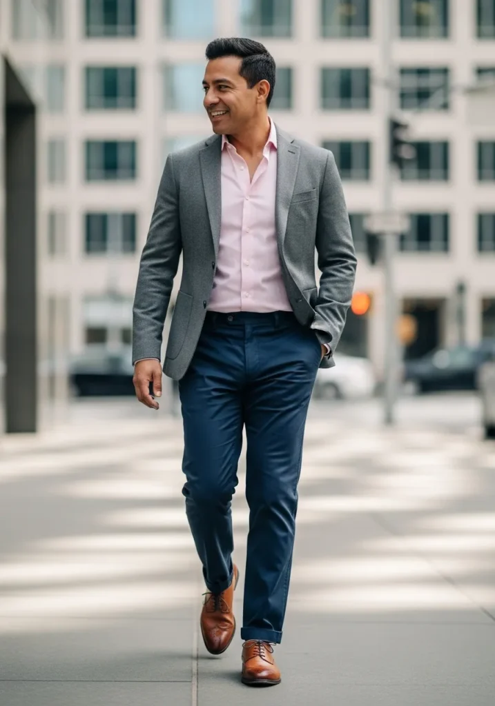 A light gray blazer layered over a soft pink button down and paired with navy trousers and brown leather shoes creates a balanced and modern ensemble. The gentle contrast keeps everything fresh and flattering.