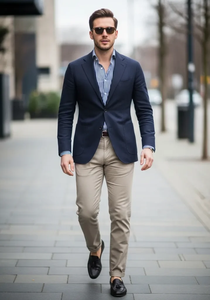 This outfit features a tailored navy blazer layered over a crisp blue and white striped button down, paired with slim khaki trousers and sleek black loafers. The structured blazer keeps everything sharp, while the light stripes add subtle contrast that makes the whole look feel fresh, modern, and effortlessly polished.