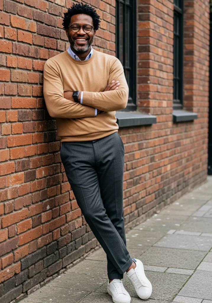 Here we have a warm camel crewneck sweater layered over a crisp blue button-down, paired with slim dark trousers and white sneakers. The outfit is stylish and balanced, bringing together preppy charm with a modern twist. His relaxed pose against the brick wall only adds to the cool factor.