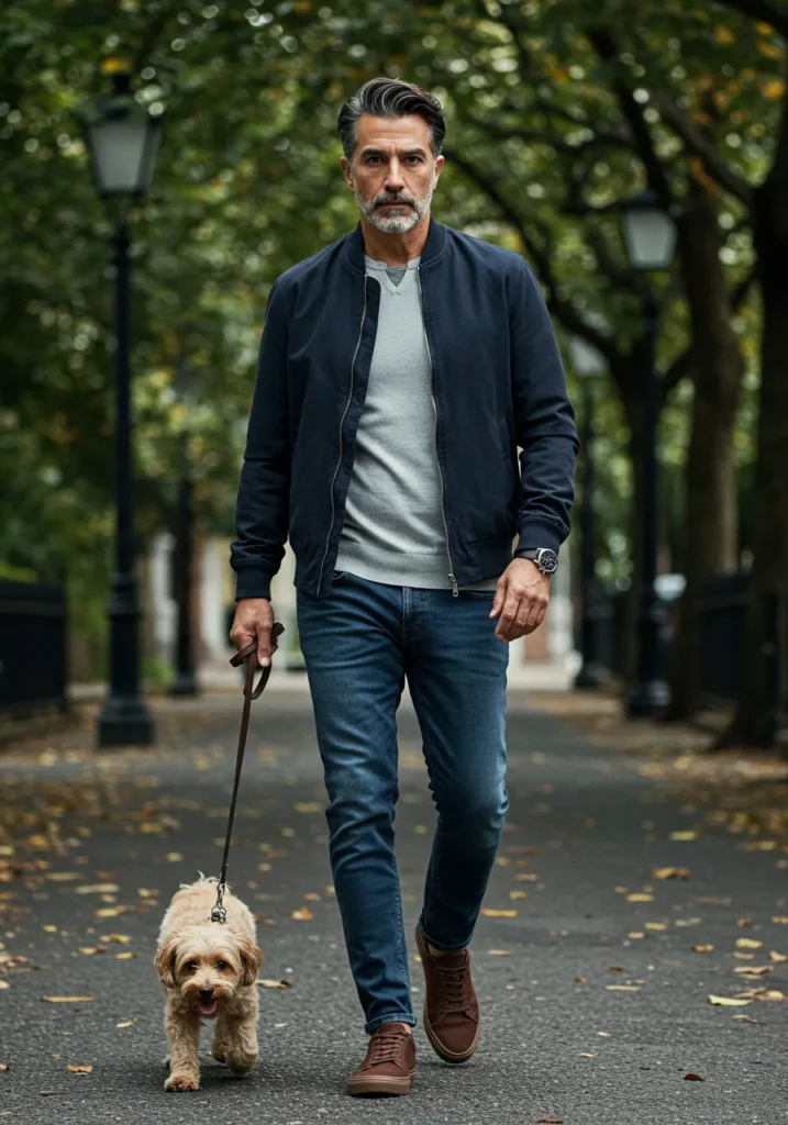 This outfit pairs a navy bomber jacket with a light grey crewneck, slim blue jeans, and brown sneakers. Walking the dog adds to the cool, lived-in vibe, showing how stylish casual can really look. It’s easygoing but with just the right amount of structure.