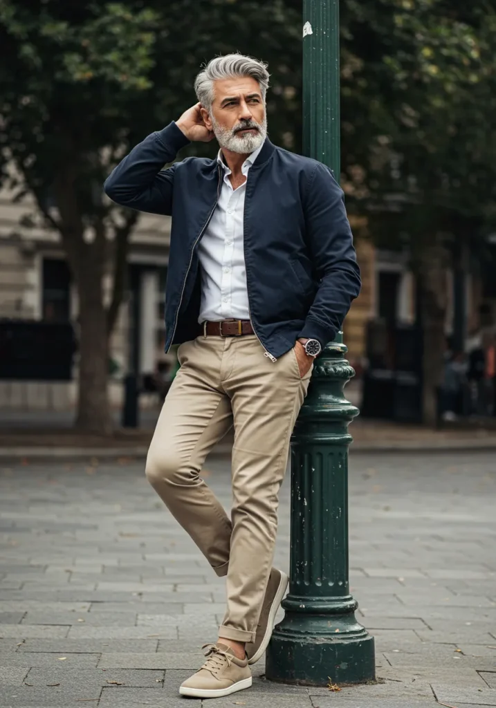 This look blends a white button-down with a navy bomber jacket, beige chinos, and tan sneakers. The leather belt and watch give it subtle polish, while the relaxed stance makes it approachable. It’s the kind of outfit that strikes the perfect balance between tailored and casual.