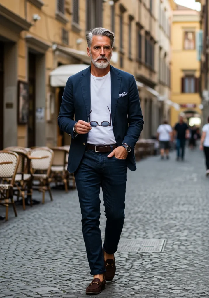 This outfit features a navy blazer layered over a crisp white t-shirt, paired with dark wash jeans and brown loafers. A pocket square peeking out adds a little extra polish, while the sunglasses in hand complete the look with casual charm. It’s sleek but still very approachable.