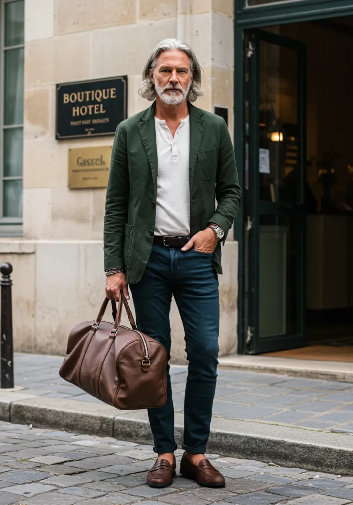 This outfit pairs a forest green blazer with a henley shirt and dark denim jeans, finished off with brown loafers and a leather duffle bag. It’s casual travel-ready style with a touch of European charm. The fit is clean, modern, and effortlessly put together.