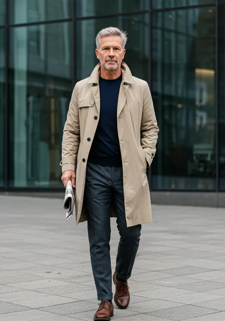 Here we see a classic beige trench coat layered over a dark crewneck and tailored trousers, paired with polished brown lace-up shoes. The newspaper tucked under his arm makes the look feel even more timeless, like something straight out of a style magazine.