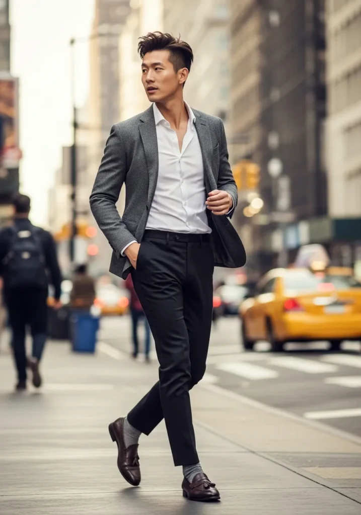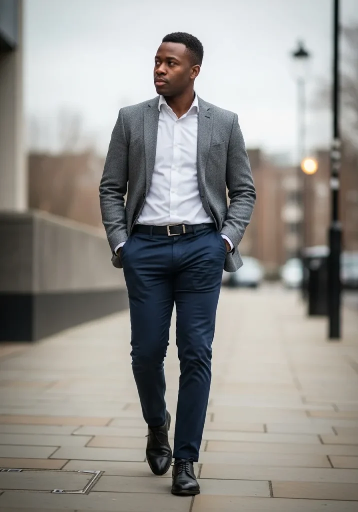 This look features a tailored grey blazer paired with a crisp white button down shirt and slim navy trousers. The shoes are dark and polished which grounds the outfit nicely. The overall color palette feels clean and professional with a modern city vibe. Everything fits close to the body without looking tight which keeps it sharp and current.