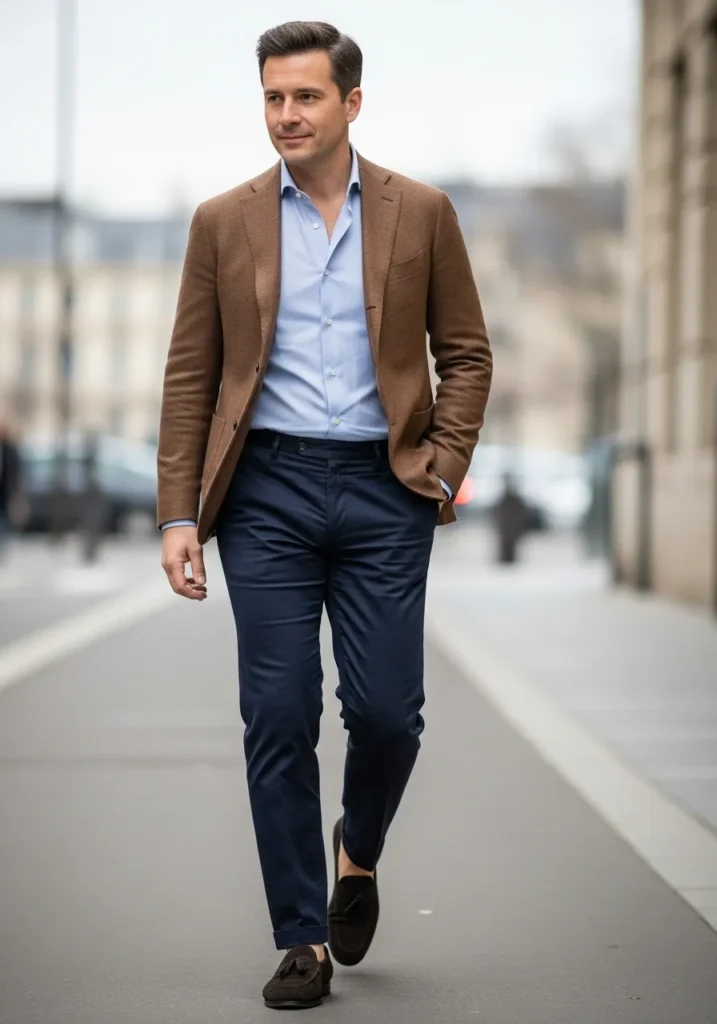 This outfit combines a warm brown blazer with a light blue shirt and navy trousers. The textures feel rich and the brown loafers add a stylish finishing touch. The overall vibe is polished but relaxed.